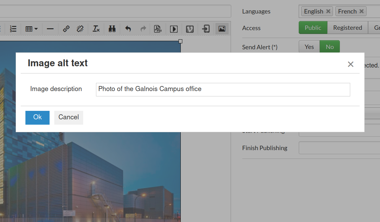 Once you've dragged you image into your content, select the image, then click the 'Image alt text' button.